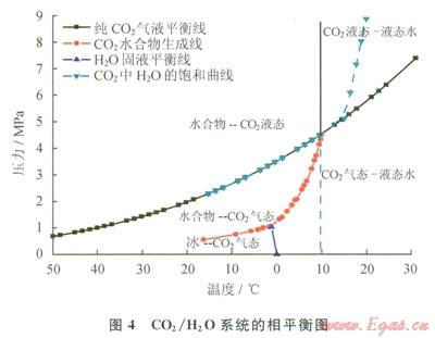CO2/H2O系統的相平衡如圖4所示。該相圖的繪制基于CO2飽和水的混合物。游離水的出現將促使水合物的生成。水合物也可以在高于CO2/H2O系統水露點的條件下形成。形成CO2水合物的必要條件為:①合適的壓力和溫度(低溫、高壓);②出現水合物形成分子;③適量的水。此外,湍流擾動可加速水合物的生成,尤其是在節流閥處、存在成核點(如焊接點和管道配件)或存在游離水條件下。