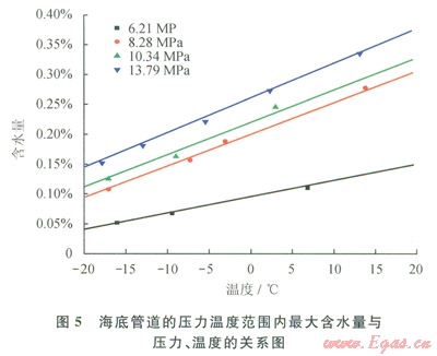 水在氣態和密相CO2中的溶解度都是有限的。水在CO2中的溶解度實際上是壓力和溫度的函數,同時受雜質含量的影響。CO2混合氣體輸送過程中含水量超過水的溶解度極限時,管內會析出游離水。游離水的出現會對CO2輸送管道的設計操作、腐蝕及水合物生成產生負面影響。