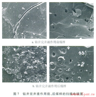 煤巖儲層鉆井過程中在正壓差作用下,鉆井完井液濾液將侵入煤層,當鉆井完井液濾液與煤層流體小配伍時,在煤層溫度、壓力、pH值等條件的作用下極易產生沉淀物。鉆井完井液固相和產生的沉淀物將堵塞煤層裂縫和孔隙,導致煤巖儲層滲透性降低。圖7為鉆井完井液作用前后煤樣掃描電鏡結果,可見鉆井完井液未作用煤樣孔隙和裂縫未被充填,具有較好的連通能力,而鉆井完井液作用后煤樣裂縫和孔隙均被不同程度充填,尤以裂縫充填最為嚴重,大大降低了原有的連通能力,使滲透率顯著下降。