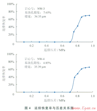 考慮原地條件下鉆井完井液損害評價,結果更真實地反映煤層的損害程度[15-16]。筆者采用滲透率恢復實驗評價鉆井完井液對煤樣滲流能力的影響,評價時將巖心被鉆井完井液動態循環反向損害后正向測得的滲透率與損害前正向測得的巖心滲透率進行對比,得到的比值稱為滲透率返排恢復率。返排恢復率越高,表明鉆井完井液對煤層滲流通道的損害越弱。實驗結果見圖4,兩塊滲透率級別相近煤樣都在較小壓差下就能突破濾餅,隨著壓差的不斷增大,煤樣的滲透率返排恢復率可達70%,表明鉆井完井液固相引起的滲透率降低程度較弱。