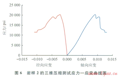 三維壓縮實驗應力 應變曲線如圖5、6所示。巖石材料的塑性與脆性可根據應力、應變曲線上負坡的坡降大小來劃分。負坡較陡者為脆性,反之為塑性。由圖5、6可知:巖樣1和巖樣2在應力分別為l2000psi(1psi=6.895kPa)和20000psi時,應變為0.01、0.009時破碎,屬于脆性巖石,且巖樣2應力、應變曲線上的負坡較陡,故其脆性優于巖樣1。
