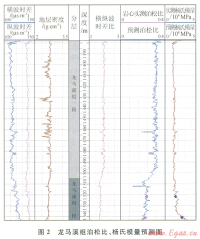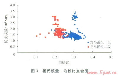 整體龍馬溪組楊氏模量介于l×104~3.5×104MPa,平均為2.3×104MPa;泊松比介于0.1~0.37,平均為0.24。通過圖3可以看出,龍馬溪組一段楊氏模量平均值為1.4×104MPa,泊松比平均值為0.3;龍馬溪組二段楊氏模量平均值為l.8×104MPa,泊松比平均值為0.23。龍馬溪組二段較龍馬溪組一段具有低泊松比,高楊氏模量,說明其脆性優于一段。圖4為橫縱波時差比和泊松比的交會圖,可以看出龍馬溪組二段的橫縱波時差比明顯低于一段,說明低橫縱波時差比參數用于表征頁巖的脆性程度是有效的。