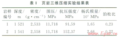 通過巖石力學實驗,龍馬溪組二段頁巖儲層基質巖石,抗壓強度分布在91~152MPa,平均抗壓強度為121.98MPa,平均楊氏模量為2.15×104MPa,平均泊松比為0.23(表1)。測試數據分析結果可知,巖樣2對比巖樣l具有低泊松比和高楊氏模量的特征,說明龍馬溪組二段在深度1541m時,頁巖脆性程度最優,與先前的礦物分析和脆性指數得到的結論相符。