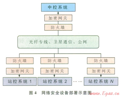 在中控系統(tǒng)和站控系統(tǒng)接入通信系統(tǒng)的邊界上部署硬件防火墻和加密網關,以抵御基于TCP/IP的網絡攻擊,并對傳輸數(shù)據(jù)進行加密保護。