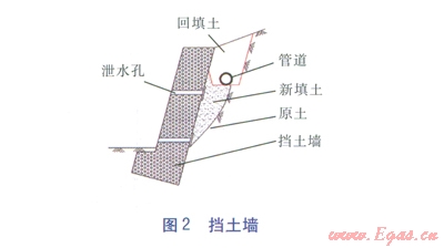 a.如果地貌允許(如荒地),首先進行分階削方處理,使管道通過處的坡度≤30°;其次在有可能產(chǎn)生積水或高跌水的位置,考慮設(shè)置漿砌塊石截水墻(見圖l)、排水溝,將水疏導(dǎo)至遠離管道的地方,避免出現(xiàn)漏斗、溶洞以及對管溝產(chǎn)生沖蝕。