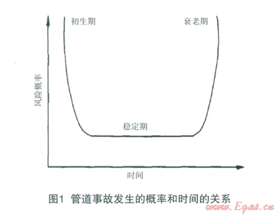 按照W.KentMuhlbauer的分類方法,造成管道失效和事故的原因共4大類:①第三方破壞。第三方破壞原因是指燃氣管道因最小埋深、地面上的活動狀況(水平)、當地居民的素質(公眾教育)、管道地上設備安全、線路狀況、巡線頻率等因素,這些因素以外力擠壓或人為破壞的形式使燃氣管道受到損壞。②管道腐蝕。腐蝕是導致燃氣管道(主要是鋼管)穿孔、破裂的重要破壞因素。對于埋地管道而言,腐蝕來自兩個方面:內腐蝕和外腐蝕。③人工誤操作。人工誤操作包括設計誤操作、施工誤操作、技術誤操作、管理與監督誤操作、運行維護與檢測誤操作等,這些誤操作會導致燃氣管網運行的安全性降低,風險增加。④管網設計。設計需考慮的因素有管道最大承受壓力、管內水擊因素、設計厚度和選材選型、士層移動、線路選擇、施工方案等,考慮不周會導致燃氣事故的發生。在實際風險管理中,用普通的概率計算方法計算其風險概率相當困難,有些還不可能實現。因此,采用美國核管理委員會(NUREG)推薦的方法,通過計算失效速率得出風險概率。由分析統計的相關資料可知,管道發生事故的風險概率一般符合U型曲線(見圖l),即初期處于磨合階段,管道工作并不穩定,后期接近設計壽命,事故發生也較頻繁。若只考慮中間的穩定期,則其風險速率v可視為常數。