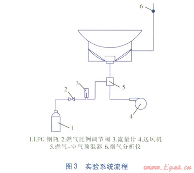 新型炒菜灶與傳統炒菜灶的實驗系統基本一致。實驗裝置包括LPG鋼瓶、煙氣分析儀、燃氣比例調節閥、流量計、電子溫度計等。煙氣分析儀用于測量煙氣中CO體積分數,燃氣比例調節閥用于調節控制LPG的流量,流量計用于計量LPG累計流量。實驗系統流程見圖3。