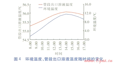 其他條件不變,采用長沙典型年1月1日8:00—17:00的逐時室外干球溫度作為環境溫度,對管段0-4出口溶液溫度進行仿真計算。環境溫度、管段出Vl溶液溫度隨時間的變化見圖4。由圖4可知,計算工況下,環境溫度從最低(1.5℃)升至最高(11.5℃),管段0-4出口溶液溫度由55.27℃升至56.07℃。