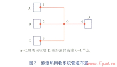 某溶液熱回收系統管道布置見圖2,溶液分別從熱質回收塔A、B、C吸收熱量后在節點0匯合,進入稀溶液儲液罐D。