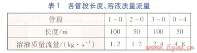 各管段長度、溶液質量流量見表1。設定節點1~3處溶液溫度均為60℃,管段1-0、2-0、3-0溶液質量分數分別為41%、38%、41%,環境溫度為5℃,各管段單位長度散熱系數均取2W/(m·K)。