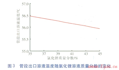 氯化鋰溶液的常用質量分數范圍為35%~45%,以管段1-0為例,當其他條件不變時,管段出口溶液溫度隨氯化鋰溶液質量分數的變化見圖3。由圖3可知,在計算工況下,氯化鋰溶液質量分數越高,溶液溫降越大。