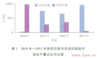 2010年—2013年蜀南氣礦在川南地區加砂壓裂鉆井累計測試產量732.49×104m3/d:其中體積壓裂獲取測試產量497.63×104m3/d,占比67.94%,常規壓裂獲取測試產量234.86×104m3/d,占比32.06%。在此期間,2010年測試產量39.82×104m3/d:其中體積壓裂1.08×104m3/d,占比2.79%,常規壓裂38.74×104m3/d,占比97.21%;2011年測試產量48.24×104m3/d:其中體積壓裂35.41×104m3/d,占比73.4%,常規壓裂12.83×104m3/d,占比26.6%;2012年測試產量498.89×104m3/d:其中體積壓裂322.52×104m3/d,占比64.65%,常規壓裂176.37×104m3/d,占比35.35%;2013年測試產量145.54×104m3/d:其中體積壓裂138.62×104m3/d,占比95.25%,常規壓裂6.92×104m3/d,占比4.75%,體積壓裂測試產量占比呈上升趨勢(圖3)。