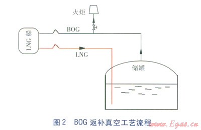 LNG船在向儲罐卸裝液體時,由于液體流出而產生真空,增加了液體卸裝的阻力,極大地增加了耗能,甚至使LNG船上的液體無法完全卸入罐內。因此,LNG接收站接收LNG時,需要及時填補LNG船艙由于液體流出所形成的真空。如采用其他氣體返補真空,既會引入新的雜質,又會造成熱量大量流入,加速LNG氣化。而LNG儲罐中產生的BOG溫度大約在-140~150℃,將BOG通過氣體返回線流回船艙填補真空,可以很好地避免上述問題。同時在BOG返回船艙時,船艙內大量LNG提供的冷量使得BOG重新液化,在一定程度上回收了BOG[7]。BOG返補真空工藝流程見圖2。