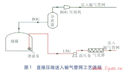 該工藝流程簡單,設備少,可以節約造價,因此,在實際中被較多采用,比如日本大阪瓦斯和東京瓦斯公司等的LNG接收站的BOG處理就是采用了這種方法[8]。但是這種方法能耗大,受下游用氣量影響較大,適應性不強,而且BOG所攜帶的大量冷能消耗于壓縮機的壓縮過程,未得到利用,造成了浪費。