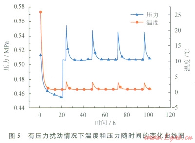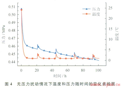 圖4、5分別表示在無壓力擾動和有壓力擾動下,靜態純水體系中C3H8水合物生成過程中溫度和壓力隨時間的變化曲線。溫度曲線表示C3H8水合物生成過程中溫度隨時間變化的曲線,而壓力曲線表示水合物生成過程中體系壓力隨時間變化的曲線。