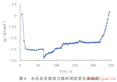 氣體水合反應驅動力可定義為氣液系統從某一初始狀態到另一平衡狀態的變化過程中摩爾吉布斯自由能變(Dg)的大小。水合反應驅動力是當Dg>0時,水合物不能生成或水合物生成速度小于分解速度;當Dg<0時,水合物可以生成或水合物生成速度大于分解速度。根據Sloan等[19]給出的等溫氣液系統水合反應驅動力公式: