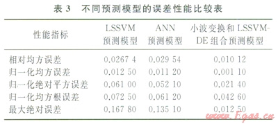 天然氣日負荷預測的常用模型有LSSVM預測模型、ANN預測模型,將筆者所建立的小波變換和LSSVM-DE組合預測模型與上述兩種常用的預測模型進行對比,采用的定量評價方法為國際上普遍采用的5種誤差評價方法,分別為相對均方誤差、歸一化均方誤差、歸一化絕對平方誤差、歸一化均方根誤差、最大絕對誤差,具體公式叮參照本文參考文獻[15]。定量評價結果見表3,定性評價結果見圖7。