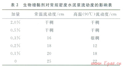 生物增黏劑對(duì)常規(guī)密度水泥漿常規(guī)性能的影響見表2、3。