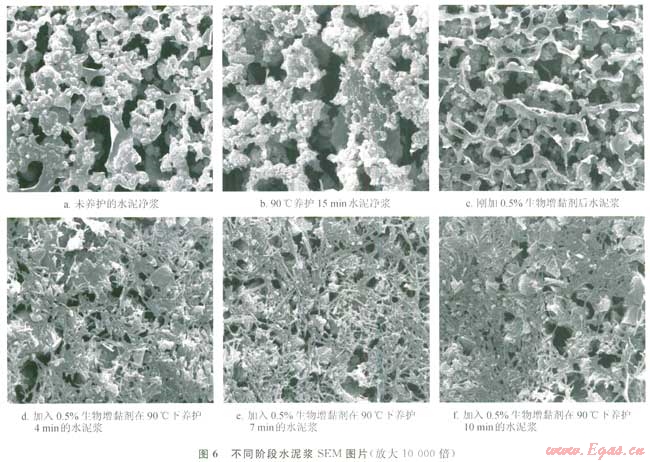 由圖6可知:生物增黏劑加入水泥漿中,隨養(yǎng)護(hù)時(shí)間的增加聚合成網(wǎng),形成比較大的網(wǎng)架結(jié)構(gòu),同時(shí)自由水因?yàn)檫@種反應(yīng)而被圈閉,微觀圖像中孔洞也隨之減少,直至稠化。這種微觀上的變化,在宏觀上的表現(xiàn)即是混漿中的水分不斷減少,造成流動(dòng)度不斷降低,直至失去可泵性。