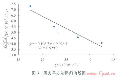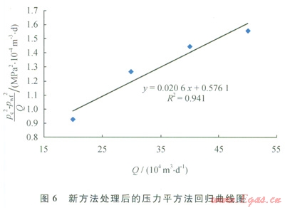 以普光B井為例來說明所建立的產能評價方法。首先,利用第2部分建立的井底流壓取值深度優化方法,得出普光8井第8~11層的累積產能為總產能的1/2,即取第8層深度處的壓力為井底壓力;其次,利用第3部分的井筒壓力分布計算模型,計算出第8層的井底流壓;第三,對該井資料進行處理,并進行壓力平方法回歸,其結果見圖6。