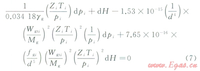 式中pi為第i段微元體內氣體壓力,MPa;Ti為第i段微元體內氣體溫度,K;Zi為第i段微元體內氣體壓縮因子;fgi為第i段微元體摩擦因子;Mg為氣體摩爾質量,g/mol,Mg=28.97gg;H為氣井的垂深,m;Wgti為第i段微元體中干氣質量流量的總流量,Wgti=Wgmi+Wgi,kg/d。