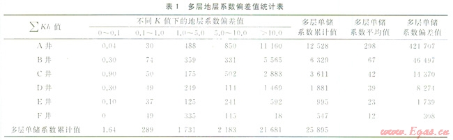筆者定義多層地層系數累積值及多層地層系數偏差值來表示地層系數的差異性。多層地層系數累積值,即各層地層系數之和;多層地層系數偏差值,即地層系數方差值,用來衡量地層系數的波動大小,方差值越大,表明地層系數波動越大,非均質性越強。表1為普光氣田5口井的地層系數偏差值。總體特征為:多層分布特征,各層滲透率差異大;多數井儲層縱向非均值性強、層數多,層間地層系數差異大。累積值為: