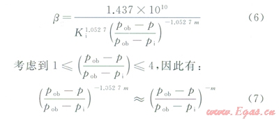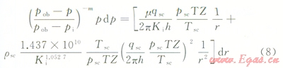 式中qsc為標準狀況下氣井產量,104m3/d;h為氣層射開有效厚度,m;`m為平均地層壓力及溫度下氣體的黏度,mPa·s;`Z為平均地層壓力及溫度下氣體的偏差系數;rsc為標準狀況下氣體密度,g/cm3;T為地層溫度,℃;Tsc為標準狀況下溫度,℃;psc為標準狀況下壓力,MPa;pob為儲層上覆壓力,MPa;pi為儲層原始地層壓力,MPa;pe為儲層目前地層壓力,MPa;p為泄油半徑處地層壓力,MPa;pwf為井底流壓,MPa;r為徑向半徑,m;re為泄油半徑,m;rw為井筒半徑,m。