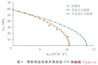 根據氣藏實際資料,計算得上覆地層壓力為61.0MPa,油藏壓力為58.2MPa,結合筆者推導的公式對產能進行分析,其結果如圖5所示。從圖5中可看出,該氣藏應力敏感效應嚴重,應力敏感效應引起的氣井無阻流量損失在23%左右。從產能測試數據分析,考慮應力敏感效應的產能方程更符合實際產能測試。因此對鶯歌海盆地異常高壓氣藏在產能評價時應考慮應力敏感效應,綜合分析確定該氣藏單井合理工作制度,盡量減少應力敏感效應對單井產量造成的損失。