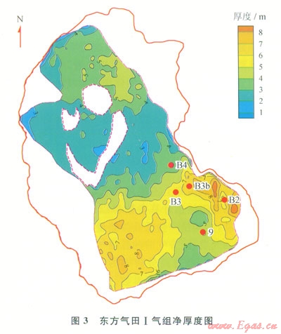 在層位標(biāo)定、斷層精細(xì)解釋的基礎(chǔ)上,利用三維地震資料進(jìn)行儲(chǔ)層頂?shù)酌娼忉專瑥膬?chǔ)層內(nèi)部各井證實(shí)的砂體旋回出發(fā),以井約束提高分辨率預(yù)處理為基礎(chǔ),有針對(duì)性地對(duì)儲(chǔ)層進(jìn)行追蹤解釋,從而得到可靠的儲(chǔ)層厚度[12]。儲(chǔ)層頂?shù)酌娴卣痦憫?yīng)一般都比較明顯,特別是在含氣范圍之內(nèi),在儲(chǔ)層厚度都大于地震分辨率所識(shí)別厚度的情況下,可以在地震剖面上從各井的標(biāo)定出發(fā),把頂面和底面都當(dāng)成單獨(dú)的界面進(jìn)行解釋,有利于得到可靠的儲(chǔ)層厚度。采用井鉆遇的流體界面、各油氣層的頂?shù)酌鏄?gòu)造圖即可計(jì)算得到各油氣層界面以上的毛厚度圖,再采用各井點(diǎn)凈毛比,通過內(nèi)插的辦法來繪出各油氣層的凈毛比圖[13]。將各氣層界面以上的毛厚度與該層的凈毛比相乘即可得到各層的凈厚度圖(圖3)。由于各氣層頂、底界面的深度圖均為可靠的研究成果,所以,根據(jù)這些深度圖計(jì)算的儲(chǔ)層毛厚度圖也是可靠的。對(duì)于各氣層凈毛比的橫向變化的描述方法,雖然有一定的局限性,但只要有效厚度的取值不大于鄰近可類比層鉆井揭示的儲(chǔ)層有效厚度平均值,這種方法是符合儲(chǔ)量計(jì)算規(guī)范的要求的。因此,以上描述出來的各油氣層的有效厚度也是可靠的。