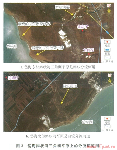 有學(xué)者認(rèn)為,岱海周圍的山前為洪積扇群[11,13-14]。但筆者經(jīng)過(guò)實(shí)地考察認(rèn)為,山前不是洪積扇,因?yàn)楹恿鞒?/span>山口處并沒(méi)有呈扇狀散開(kāi)的礫質(zhì)沉積,而是繼續(xù)以河道形式向盆地內(nèi)延伸,衛(wèi)星照片上也沒(méi)有顯示扇體的輪廓,這與新疆、青海地區(qū)的典型洪積扇完全不同。因此筆者認(rèn)為,該區(qū)山前為辮狀河平原,僅西部長(zhǎng)軸方向發(fā)育一條曲流河,并形成曲流河平原(圖1)。