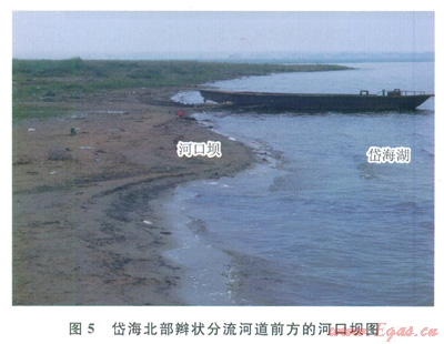 河口壩位于分流河道入湖口前方,總體呈舌狀,地形上略有隆起,壩脊大體垂直湖岸延伸,是河水靠慣性向前方流動(dòng)、沉積所致(圖5,由于水位下降,部分河口壩已露出水面)。河口壩向湖內(nèi)延伸距離為幾十米到100多米,可延至水深1.5m左右處。