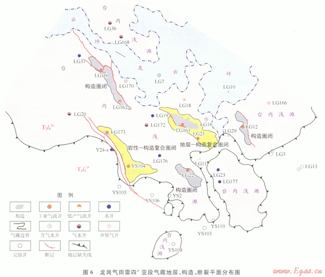 3)在大型地層尖滅的背景上,受構(gòu)造、斷層和巖性變化影響,發(fā)育地層 構(gòu)造、巖性一構(gòu)造等多種圈閉類型。雷四3亞段a小段尖滅帶附近的次級巖溶斜坡是尋找工業(yè)氣井的最有利區(qū)。