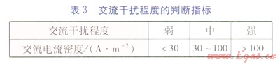 GB/T 50698—2011《埋地鋼質管道交流干擾防護技術標準》中第3.0.5條規定:“當管道上的交流干擾電壓不高于4V時,可不采取交流干擾防護措施;高于4V時,應采用交流電流密度進行評估。”高于4V時的交流干擾程度的判斷指標參照GB/T 50698—2011《埋地鋼質管道交流干擾防護技術標準》中3.0.6條(見表3)。