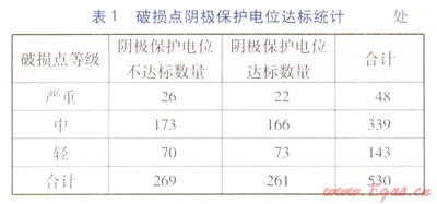 測得530處防腐層破損點管道電位分布情況是:261處防腐層破損點極化電位為-950~-850mV,達到最小保護電位要求(-850mV),破損點陰極保護電位達標統計見表1。