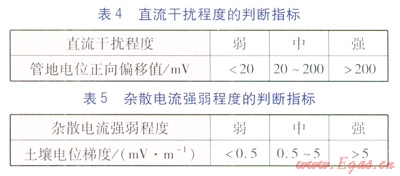 SY/T 0017—2006《埋地鋼質管道直流排流保護技術標準》中第3.0.1條規定:“處于直流電氣化鐵路、陰極保護系統及其他直流干擾源附近的管道,應進行干擾源側和管道側兩方面的調查測試。當管道任意點上的管地電位較自然電位偏移20mV或管道附近土壤電位梯度大于0.5mV/m時,確認為直流干擾。”第3.0.2條規定,管道直流干擾程度一般按管地電位較自然電位正向偏移值按表4所列指標判定;當管地電位較自然電位正向偏移值難以測取時,可采用土壤電位梯度按表5所列指標來判斷雜散電流的強弱程度。