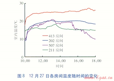 12月27日10:O0室內溫度為9.05℃,l3:O0左右溫度持續在20℃左右,l6:30以后室內溫度逐漸下降,l8:00室內溫度為18.31℃。相對濕度基本在25%以下。