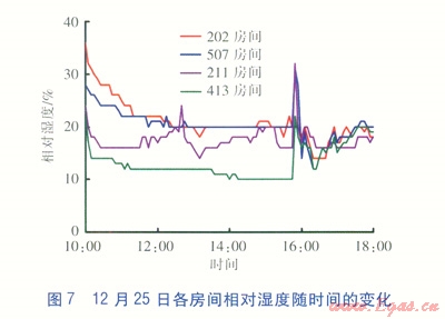 12月25日室內溫度從l0:00的15.69℃上升至15:45的28.06℃,之后開始下降。截至18:00,室內溫度為16.81℃。房間相對濕度很低,約l0%左右,至l5:50開始相對濕度突然有所增加,并逐步上升到20%。