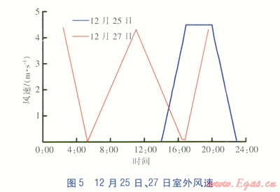12月25日、27日逐時室外溫度、風速分別見圖4、5。由圖4、5可知,測試日室外溫度變化趨勢基本一致。最高室外溫度均出現在16:40左右,25日、27日最高室外溫度分別為5.9、6.6℃。日最低室外溫度基本出現在8:00前后,25日、27日最低室外溫度分別為-9.07、-8.03℃。25日14:O0之后開始起風,風速在16:00左右升至4.5m/s;27日全天風速變化范圍0~4.5m/s。由實測結果可知,25日、27日室外空氣相對濕度變化范圍分別為6.04%~24.26%、5.52%~19.38%。