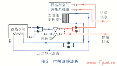該建筑為拉薩市某多層辦公建筑,建筑共5層,總建筑面積為7500m2,辦公建筑典型層的平面布置見圖1。供暖方式采用以太陽能熱水系統為主、空氣源熱泵為輔的形式,室內供暖裝置為風機盤管。供暖室內設計溫度為20℃,供、回水溫度為45、40℃。供熱系統流程見圖2。乙二醇水溶液經過太陽能集熱器(平板形)加熱后進入蓄熱水箱,蓄熱水箱出水經板式換熱器與供暖回水換熱。若換熱后的水溫低于45℃,低溫型空氣源熱泵啟動,將水溫加熱至45℃后供給末端風機盤管;若換熱后的水溫達到45℃,低溫型空氣源熱泵不啟動,熱水直接供給末端風機盤管。