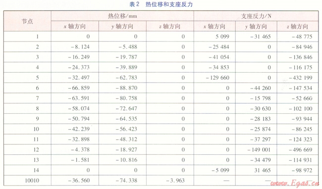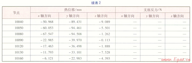 輸入數據:熱水溫度130℃,設計壓力1.6MPa,管材Q2358,管道外直徑1220mm,直管壁厚16mm,彎頭壁厚18mm。其他參數可通過AutoPSA應力分析軟件,實現手動調用或自動調用。建立好的計算模型經AutoPSA應力分析軟件分析計算,得到一次應力、二次應力、熱位移、支座反力。應力驗算結果見表1,熱位移、支座反力見表2。由表1可知,供熱管道各單元的一次應力、二次應力均滿足《規范》要求。表2數據可作為結構專業設計桁架的基礎數據,表中負號表示方向與坐標軸正向相反。