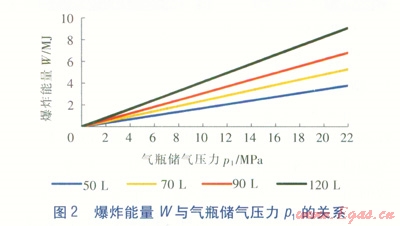 由公式(1)~(3)可知,若要計算爆炸能量,就需要確定爆炸前氣瓶容積V1和儲氣壓力p1。氣瓶容積具有較大的隨機性,當氣瓶內氣體壓力達到氣瓶的塑性極限壓力時,氣瓶容積一般變大為氣瓶設計容積的110%~125%,其取值與氣瓶制造質量等因素有關。GB 17258—2011《汽車用壓縮天然氣鋼瓶》規定,氣瓶的公稱容積為30~300L,其中30~120L的氣瓶公稱容積的允許偏差為2.5%,120L以上氣瓶公稱容積的允許偏差為1.25%。常用的氣瓶公稱容積有50、70、90、120L等。為了簡化研究,本文的氣瓶容積取氣瓶的公稱容積,不考慮其變化和偏差。根據公式(1)~(3),繪制出當爆炸前氣瓶儲氣壓力p1為20.101MPa時,即爆炸前氣瓶在充裝壓力20MPa下,爆炸能量肜與氣瓶容積V1的關系見圖1。