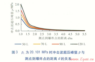 當Z≥1時,公式的精確度較高;當Z<1時,測點距爆炸點較近,因受到爆炸產物的影響,使得數據有一定的偏差。根據公式(5)~(7),繪制出當爆炸前氣瓶儲氣壓力p1為20.101MPa時,氣瓶容積V1分別為50、70、90、120L的4種常用氣瓶,爆炸產生的沖擊波超壓峰值p與測點到爆炸點的距離d的關系曲線,見圖3。
