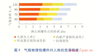 ②本文得出了常用規格的氣瓶發生物理性爆炸時,對人體各種損傷程度的危害范圍(即不同程度損傷下測點到爆炸點的距離),以及人員活動的安全區域,可以為事故的安全防范提供理論指導。