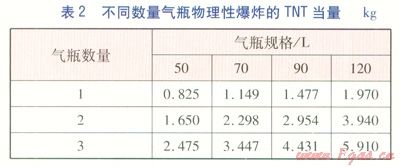 另外,部分CNG汽車會將幾個氣瓶放在一起,且放置距離較近。當一個氣瓶發生爆炸時,可能會引發周圍的其他氣瓶爆炸,從而導致爆炸能量成倍增加。表2為不同數量的4種常用氣瓶在20MPa的情況下破裂后發生物理性爆炸的TNT當量。