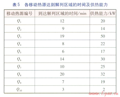 移動熱源(Q1~Q10)至解列區域M的出救路線見圖4。各移動熱源達到解列區域的時間及供熱能力見表5。設解列區域的最低限額供熱量為50kW,考慮移動熱源到達解列區域時間以及式(2),得到出救移動熱源順序為Q10、Q5、Q9、Q4,即解列區域恢復供熱的最短時間為8min。考慮移動熱源供熱能力后,最優出救移動熱源順序為Q5、Q9、Q4,此時解列區域恢復供熱的最短時間仍為8min。由算例可知,通過優化在出救時間最短標準不變的條件下,出救移動熱源數量減少,從而提高了移動熱源出救的經濟性。