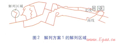 按照解列最不利熱用戶的原則,并根據閥門設置情況,選取解列方案1、2。兩種解列方案中解列區域分別見圖2、3。解列方案1、2的解列區域分別包括15、34個熱用戶,被解列熱用戶總設計質量流量分別為1030、2220t/h。解列區域最低限額供熱系數仍取0.807,則解列方案1、2的解列區域事故工況下的質量流量分別為832、1792t/h。
