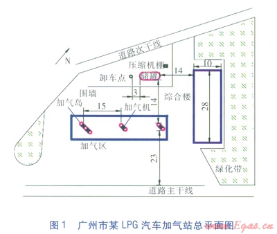 廣州某LPG加氣站為三級(jí)加氣站,設(shè)置有30m3臥式埋地儲(chǔ)罐1臺(tái),4臺(tái)加氣機(jī),24支加氣槍,總造價(jià)為300×104元人民幣。LPG汽車加氣站站區(qū)主要由儲(chǔ)罐、卸車點(diǎn)、壓縮機(jī)以及加氣島等組成。總平面布置見(jiàn)圖1。