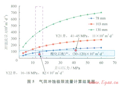 在氣田生產(chǎn)過程中,為了進一步分析產(chǎn)量過高的原因產(chǎn)生的沖蝕,開展了不同單井井口壓力和產(chǎn)量下的臨界沖蝕流量的計算。根據(jù)氣田的具體情況,井口設(shè)備的節(jié)流閥通徑分別為78mm、103mm、130mm。因此,分別計算了氣田工況范圍下的單井極限沖蝕流量。根據(jù)計算結(jié)果可以看到,將2口典型井在試氣時的工況標在計算圖(圖4)中,2口井均在沖蝕流量之下(圖5)。在氣田生產(chǎn)中,根據(jù)開發(fā)配產(chǎn),建議井口產(chǎn)氣量限制在70×104~95×104m3/d,少數(shù)井配產(chǎn)在100×104m3/d或以上時,井口閥的尺寸要求換成100.5mm。由此確定井口采氣樹選擇如下:產(chǎn)量小于80×104m3/d,主通徑(標稱尺寸)為78mm;產(chǎn)量在80×104~200×104m3/d,主通徑為103mm;產(chǎn)量大于200×104m3/d,主通徑為130mm。
