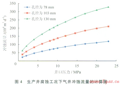 計算了不同井口壓力下不同孔徑尺寸(標稱尺寸,最小內(nèi)徑)沖蝕流量(圖4),計算的生產(chǎn)工況范圍按照氣田的實際情況確定。根據(jù)計算,油壓為15~18MPa,井口溫度為60~70℃,Æ78mm節(jié)流閥抗沖蝕流量為85×104~112×104m3/d。氣田的產(chǎn)量最高達126×104m3/d,一般井產(chǎn)量均大于85×104m3/d。因此,生產(chǎn)過程中長期存在沖蝕現(xiàn)象,這是井口腐蝕嚴重的重要原因之一。根據(jù)計算結(jié)果,在目前的工況下,為避免沖蝕和安全生產(chǎn),一些單井產(chǎn)量最好控制在85×104m3/d以下。