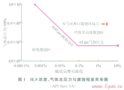 根據(jù)NACE標準H2S和CO2分壓與腐蝕程度關(guān)系(圖1),如果H2S氣體的分壓大于0.34474kPa(0.05psi絕對壓力,1psi=6.895kPa,下同),則必須使用抗硫化氫材料。根據(jù)腐蝕環(huán)境分析,氣田位于中至高度腐蝕區(qū)。氣田CO2分壓與H2S分壓之比小于200,系統(tǒng)腐蝕以H2S為主導(dǎo)。